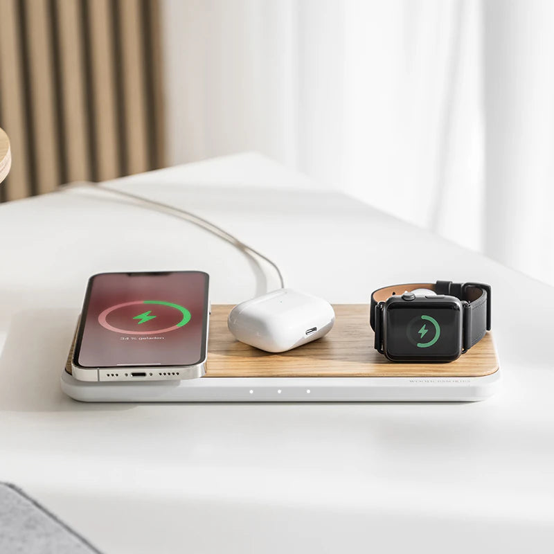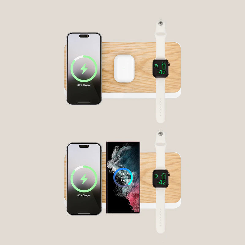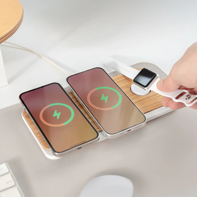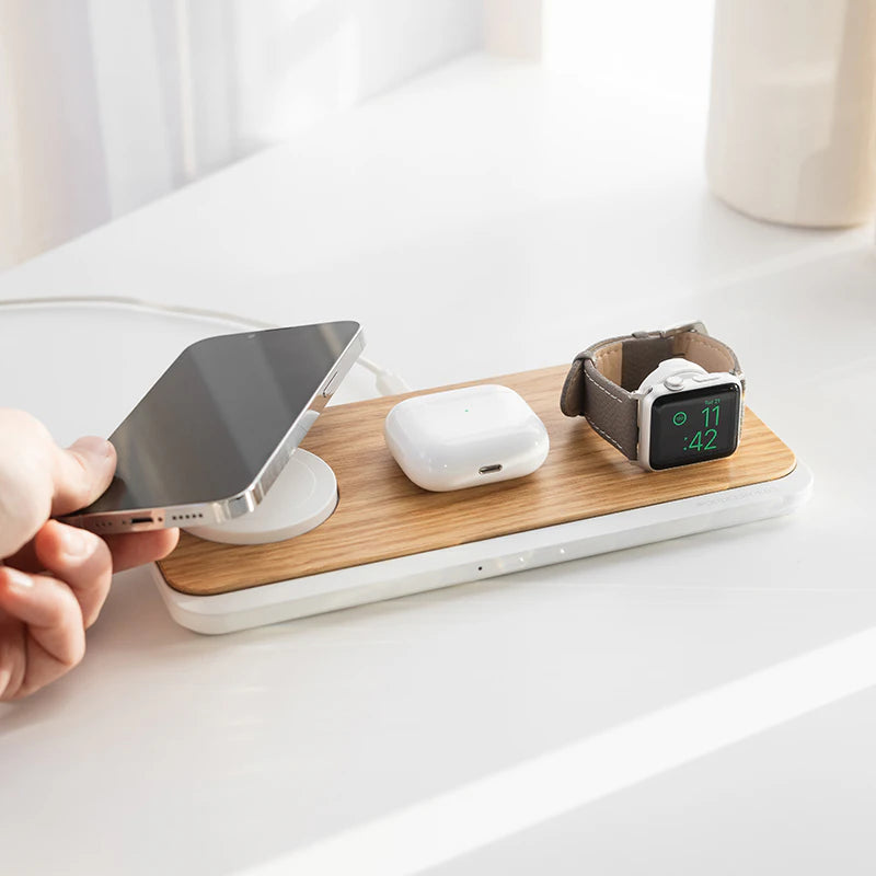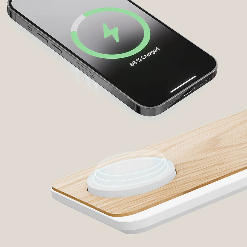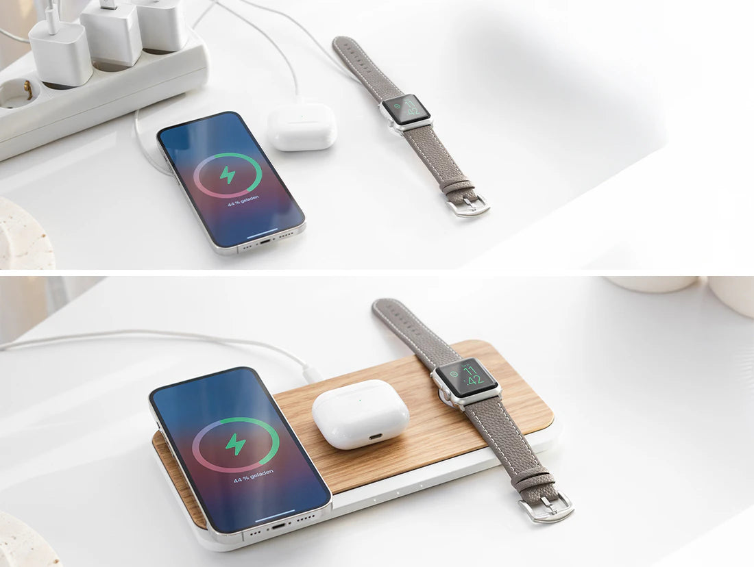 Charging made Beautiful with MultiBase Pro! Modernste MagSafe© Technologie trifft auf edle Materialien, um das stillvollste und praktischste Ladeerlebnis aller Zeiten zu bieten! Dank magnetischen Ladezonen, drehbarem Apple Watch Modul, 15W Fast Charging und einer Gesamtleistung von 30W wird die MultiBase Pro das neue Zuhause für deine wichtigsten Devices! Intelligente LED-Lichtsensoren dimmen die Helligkeit für das perfekte Setup auf dem Nachttisch. Jetzt neu aus Eichenholz!