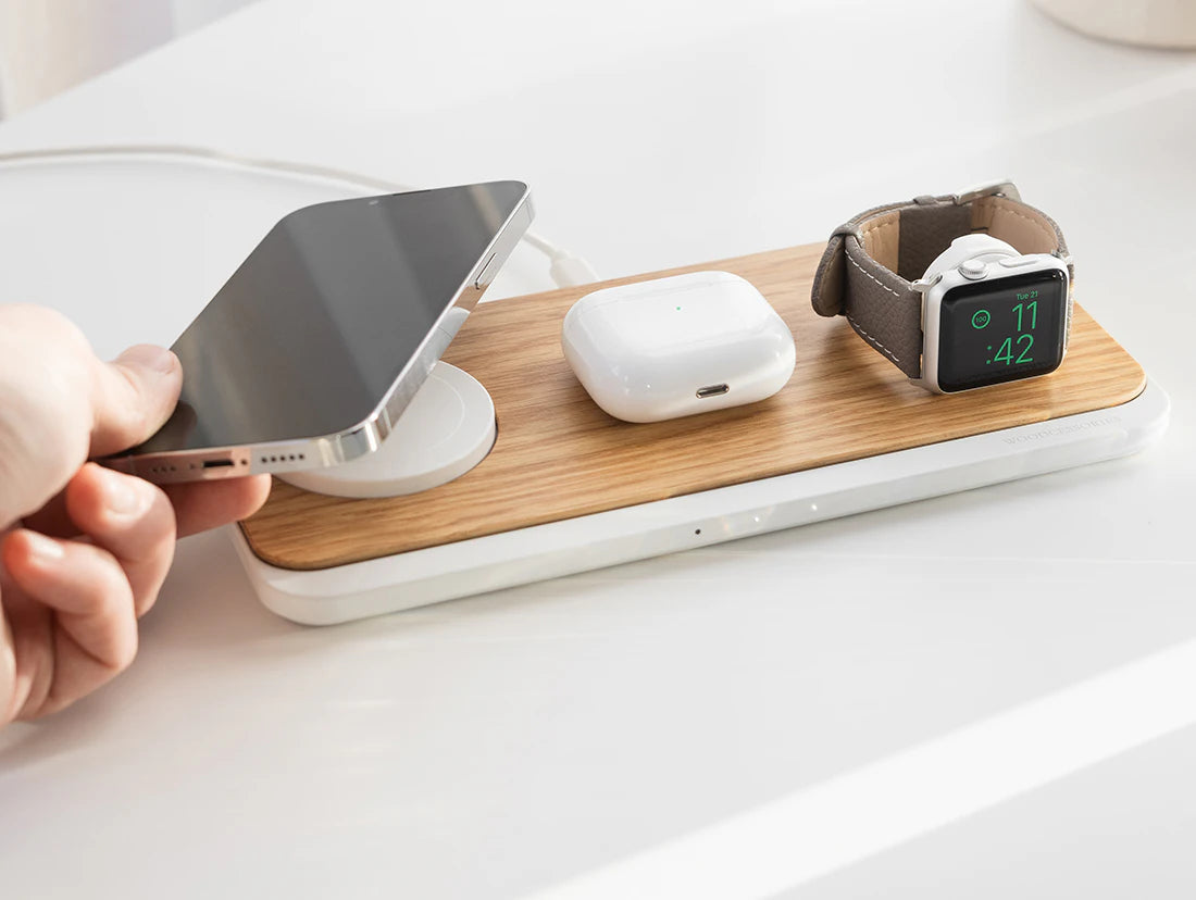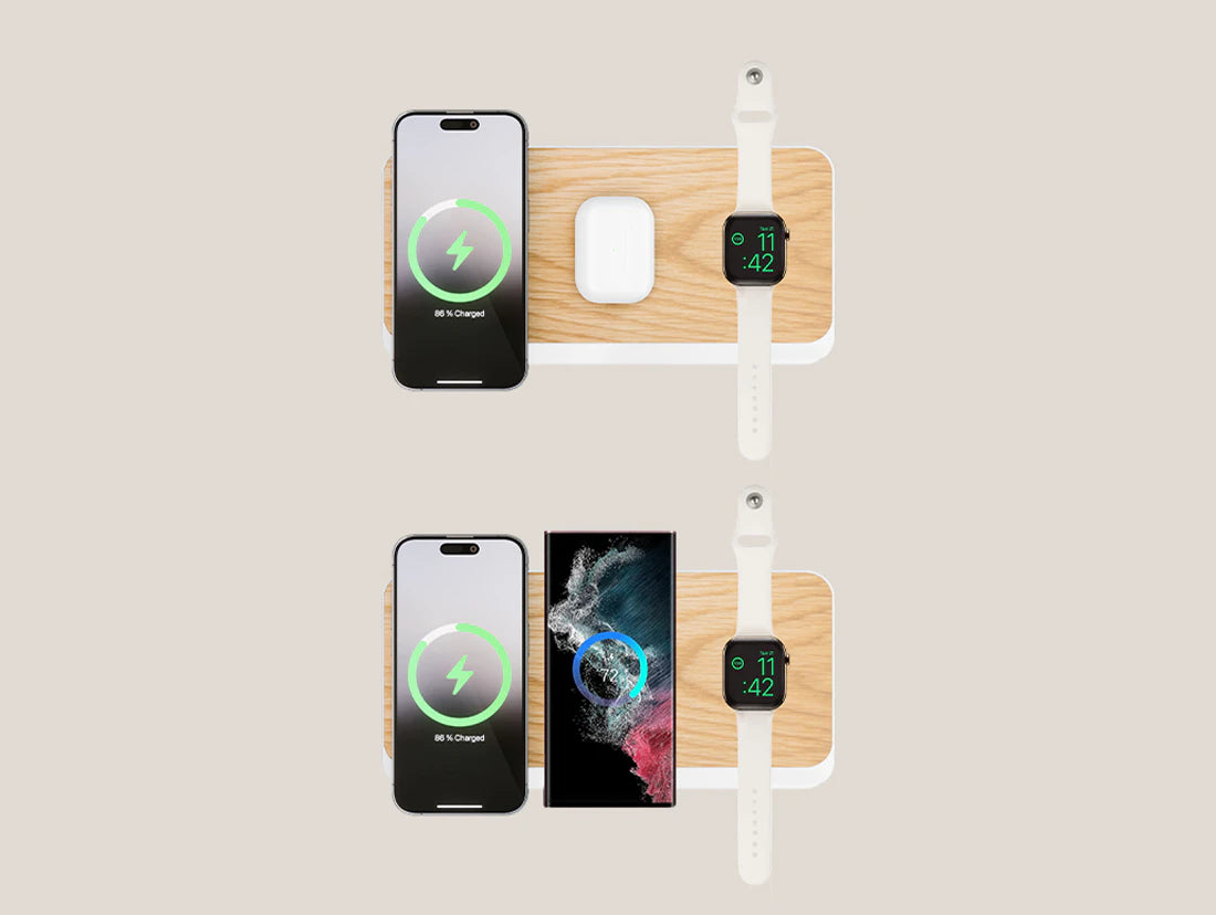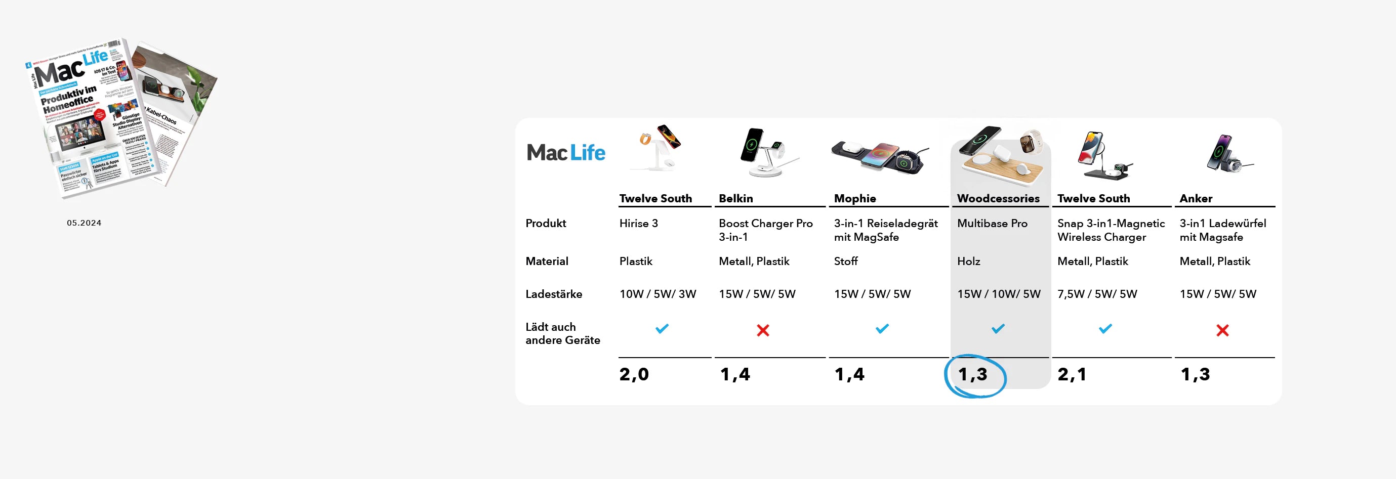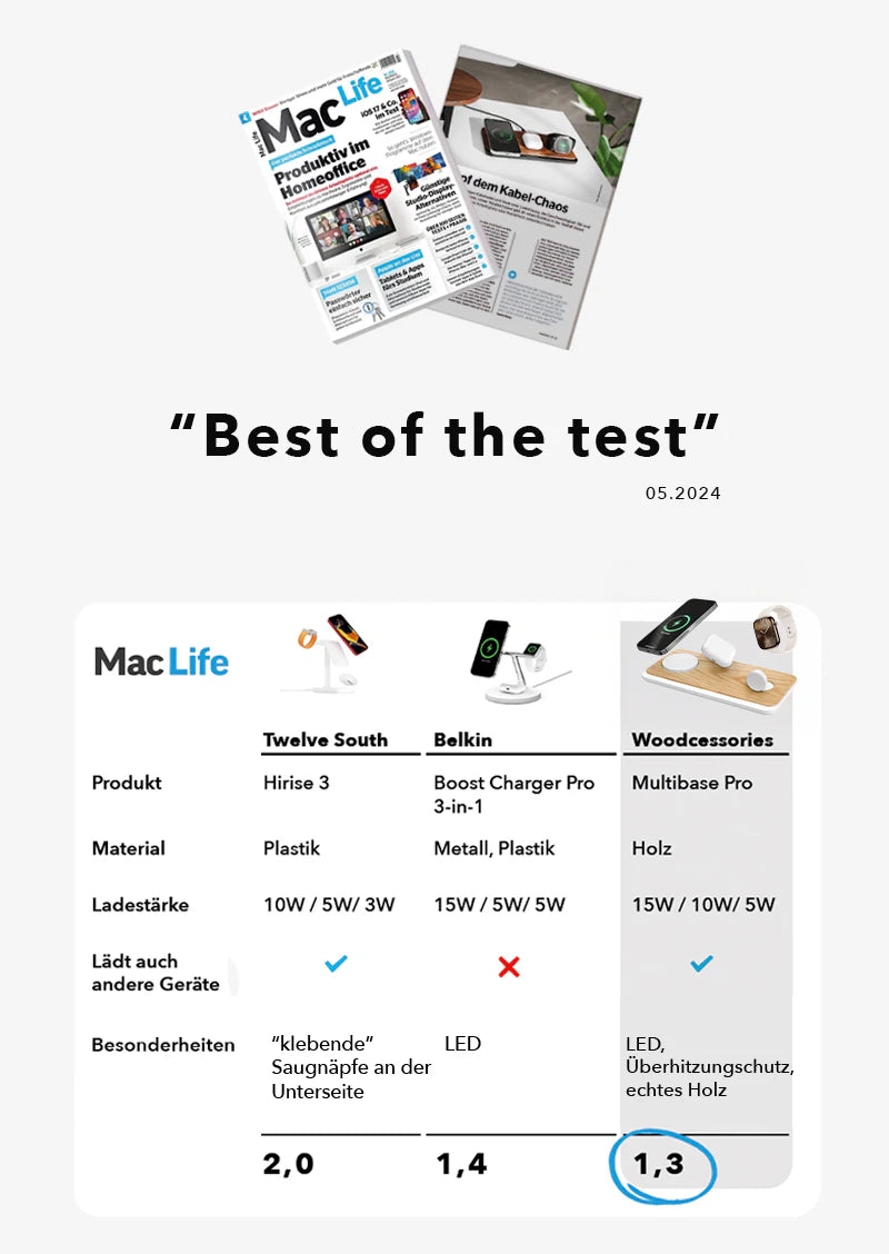 Charging made Beautiful with MultiBase Pro! Modernste MagSafe© Technologie trifft auf edle Materialien, um das stillvollste und praktischste Ladeerlebnis aller Zeiten zu bieten! Dank magnetischen Ladezonen, drehbarem Apple Watch Modul, 15W Fast Charging und einer Gesamtleistung von 30W wird die MultiBase Pro das neue Zuhause für deine wichtigsten Devices! Intelligente LED-Lichtsensoren dimmen die Helligkeit für das perfekte Setup auf dem Nachttisch. Jetzt neu aus Eichenholz!