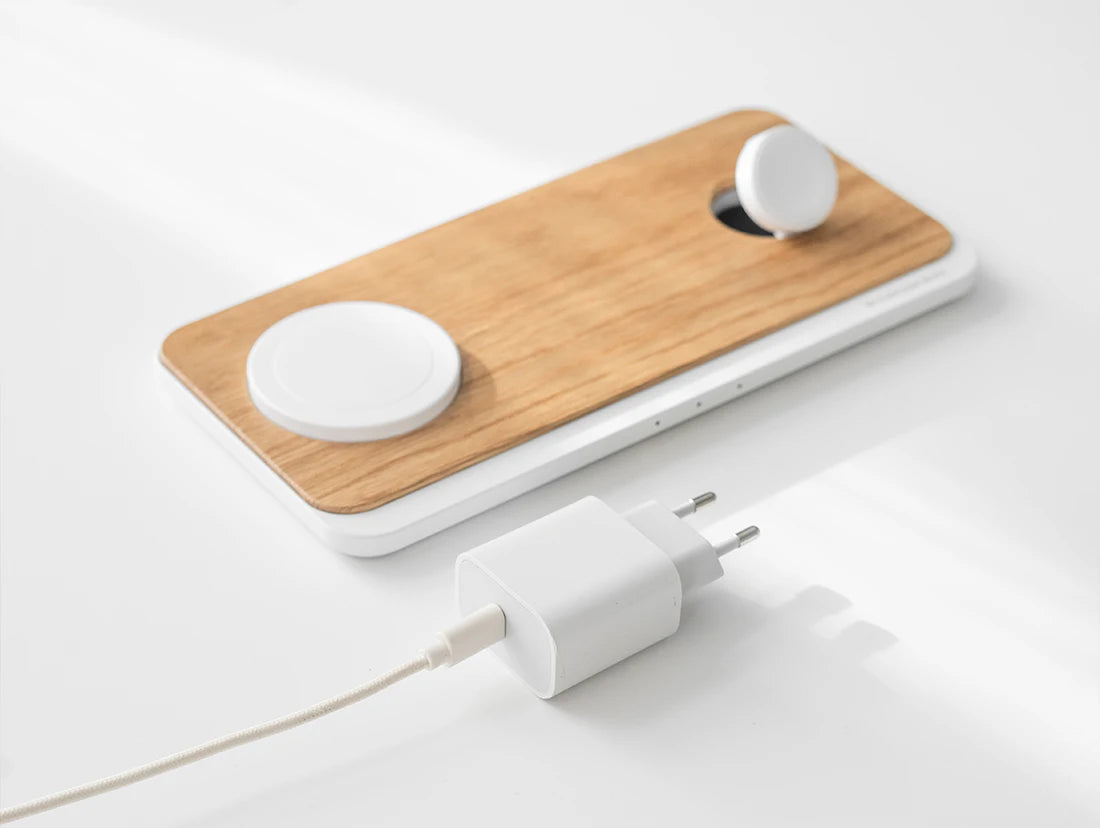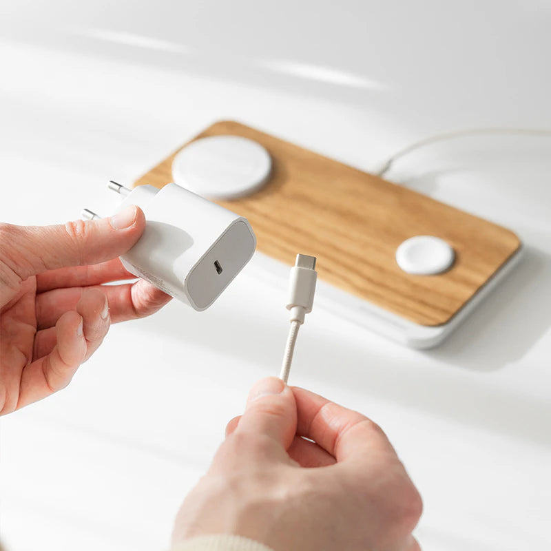 Die induktive Ladestation kommt mit einem USB-Kabel. Den USB-C-Stecker einfach an die Qi Ladestation anschließen und das andere Ende des Kabels mit einem beliebigen Standard-USB-Adapter mit der Steckdose oder Stromquelle verbinden oder an einem Endgerät (Laptop, MacBook, iMac, etc.) anschließen. Das iPhone oder die Apple Watch auf die magnetischen Ladefelder auflegen und schon wird geladen! Technische Voraussetzung um die induktive Ladestation zu nutzen, ist ein Netzteil mit mindestens 45W Leistung.