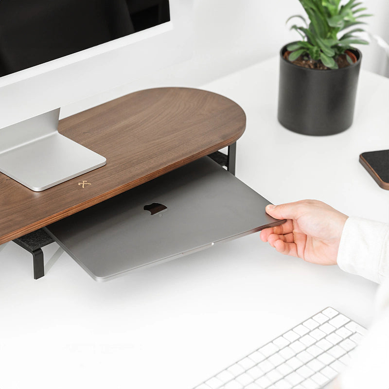 Ausgewähltes Walnuss und Eichenholz in Verbindung mit einer Basis aus mattem, recyceltem Aluminium verleihen dem Monitorständer ein nachhaltiges Design.