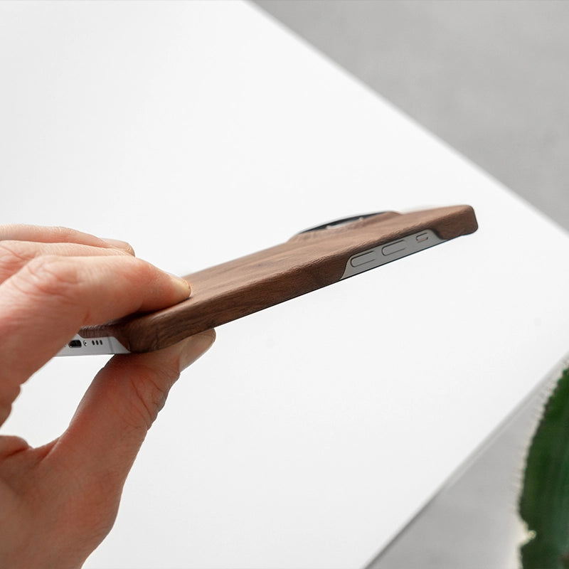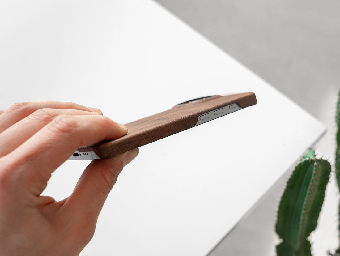 Dank der ultradünnen Holzschicht ist die Verwendung des Apple MagSafe© Chargers überhaupt kein Problem. So bleibt die volle Magnetkraft zwischen deinem iPhone und deinem Wireless Charger erhalten und sorgt für den nötigen Halt. Auch das Leder Wallet von Apple hat einen gewissen Halt. Wir weisen dich aber darauf hin, dass das MagSafe Leder Wallet nicht die stärkste magnetische Zugkraft besitzen und so bei der glatten Oberfläche unseres Slim Cases verrutschen kann. Wir arbeiten aber bereits an einer eigenen Lösung!