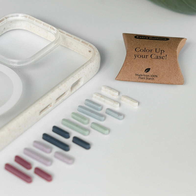 Mit unserer Button Box erhältst du 6 austauschbare Knöpfe in verschiedenen Farben mit denen du dein Clear Case individuell gestalten kannst.