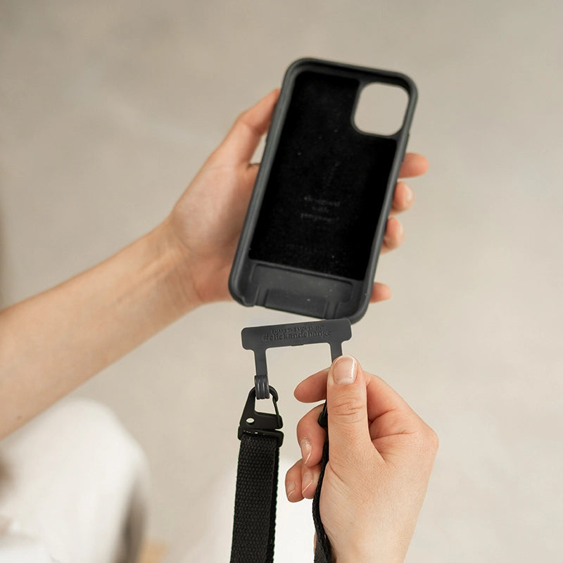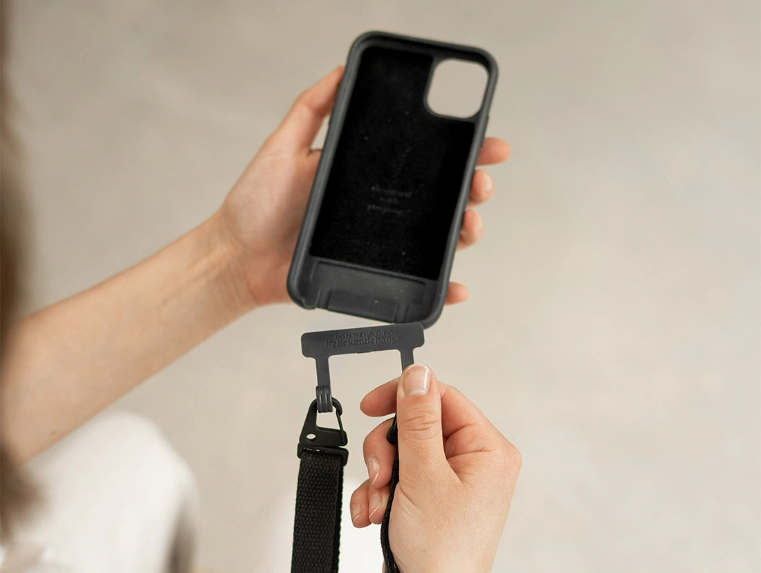 Das funktioniert kinderleicht: Du musst ganz einfach nur den Haken der modularen Kette in die passende Einbuchtung unten in deinem Case einklicken und schon kann's auf in dein nächstes Abenteuer gehen!