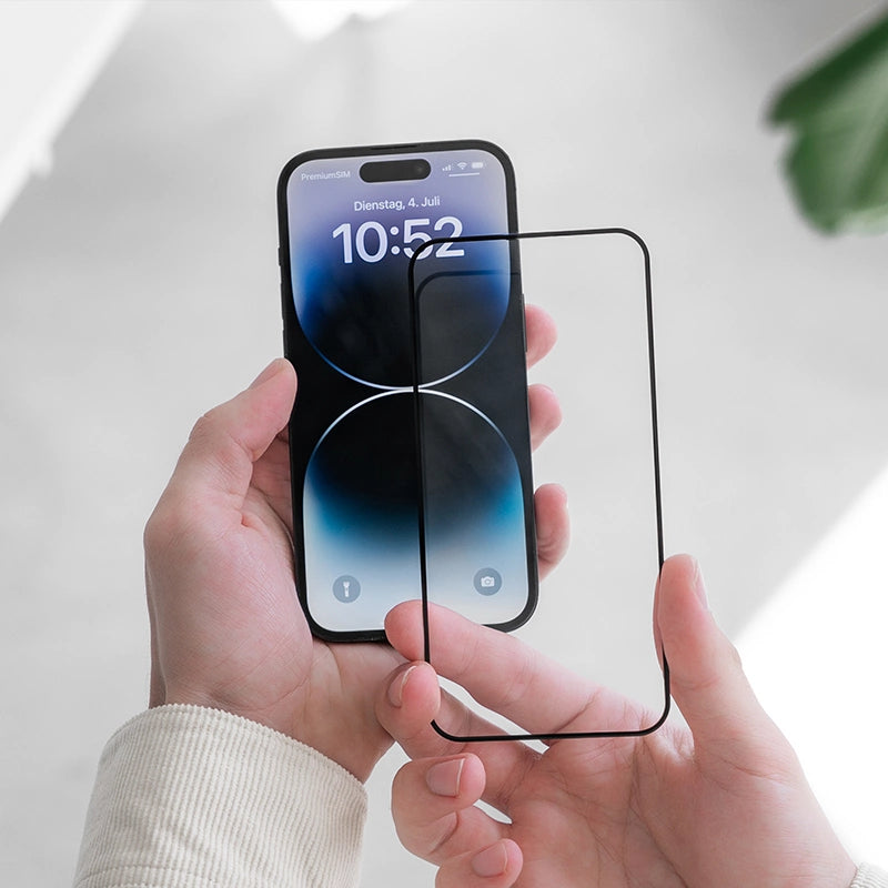 Das kratzfeste Asahi-Glas schützt dein Display mit Ultra Härtegrad 9H! Dank der abgerundeten Kanten und der 3D Optik fällt das Schutzglas für dein iPhone 17 Pro kaum auf! Das selbstklebende Schutzglas schmiegt sich mit nur einem Fingerabdruck in Sekundenschnelle blasenfrei an dein Display an!